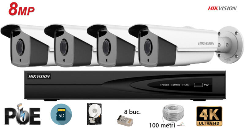 Hikvision komplett megfigyelő készlet 4 IP kamera, 8MP(4K), SD-kártya, IR 50m A videó megfigyelő készlet egy komplett rendszer, amely tartalmazza a videó megfigyeléshez szükséges összes komponenst, amelyet a vezető Hikvision gyártó kínál a legmagasabb szintű termékekben. minőségi szabványok, amelyek tiszteletben tartják a hatályos európai normákat. Ez a rendszer általában minden felhasználónak készült, nem csak a telepítőknek, tekintettel a telepítési folyamat alacsony nehézségi fokára. A telepítési technika megkönnyítése érdekében a jelet és a teljesítményt egyidejűleg továbbító UTP-kábel már préselve (bedugva). A videó megfigyelő készlet sok helyzetben hasznosnak bizonyul: Csomag tartalma: 1 x IP NVR HIKVISION 4 videocsatorna 8MP(4K) DS-7604NI-K1-4P(B) 4 x IP kamera HIKVISION 8MP(4K), SD-kártya DS-2CD2T83G0-I5-2.8mm IR 50M 1 x HDD 1 TB 1 x 100m UTP kábel 8 x RJ45 csatlakozódugó IP NVR HIKVISION Ultra HD 8MP(4K) DS-7604NI-K1-4P(B) Ez az NVR HIKVISION egy modern IP hálózati videorögzítő képes monitor, rekord ?is? 4 IP megfigyelő kamera képét játssza le megapixeles felbontással, akár 8 MP-en. Ez a modell tartalmaz 4 portos PoE kapcsolót a közvetlen csatlakozáshoz? a szobák közül. Független HDMI kimenet? (4K felbontásig) és VGA (1080p felbontásig) különböző képernyőmérettel jeleníthet meg képeket. Mindegyik monitor képes bármilyen kameráról származó videót megjeleníteni? a rendszerből, bármely képernyőfelosztásban. A SATA port lehetővé teszi a felhasználó számára maximum kapacitású merevlemezt telepíteni? 6 TB-ig. IP KAMERA HIKVISION 8MP(4K), SD-kártya DS-2CD2T83G0-I5-2.8mm, IR 50M A HIKVISION kamera 8MP(4K) felbontású intelligens infravörös funkcióval éjjel 50m-ig, a fix 2.8mm-es objektív biztosítja a látványt 124 fokos szögben, kiváló minőségű képeket továbbít valós időben közvetlenül az NVR-re. A kamera időjárásálló, IP67 védelmi fokozattal rendelkezik. Merevlemez 1 TB Merevlemez 1 TB, nagy sebességű SATA III interfésszel érkezik, 7200 RPM (3 Gb/s), amelyet úgy terveztek, hogy nagy teljesítményt és rendkívül csendes működést biztosítson nagyon alacsony hőmérsékleten. 100m x UTP kábel (jel+táp) 8 x RJ45 csatlakozó
