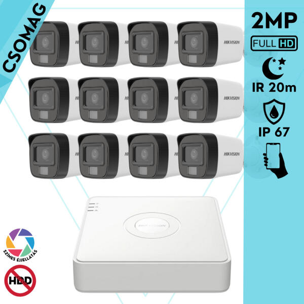 Hikvision 12 cső kamerás analóg megfigyelőrendszer 2MP biztonsági kamera, IR megvilágítás 20 m, fehér fény 20 m, kültéri (DS7116HGHIM1T-DS2CE16D0TEXLF28MM-KOMPAKT-12)