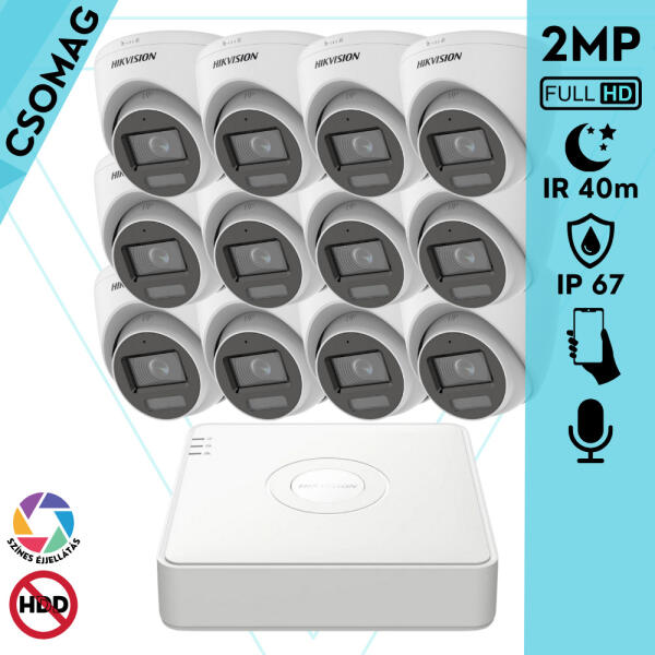 Hikvision 12 turret kamerás analóg megfigyelőrendszer 2MP biztonsági kamera, IR megvilágítás 40 m, fehér fény 20 m, beépített mikrofon, kültéri (DS7116HGHIM1T-DS2CE78D0TLFS28MM-TURRET-12)