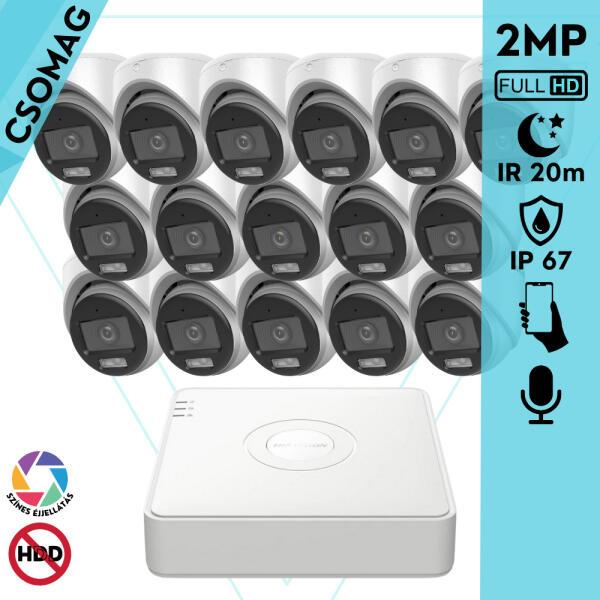 Hikvision 16 turret kamerás analóg megfigyelőrendszer 2MP biztonsági kamera, ColorVu Dual-light látható fény 20m, beépített mikrofonnal, kültéri (DS7116HGHIM1T-DS2CE70DF0TLMFS28MM-TURRET-16)