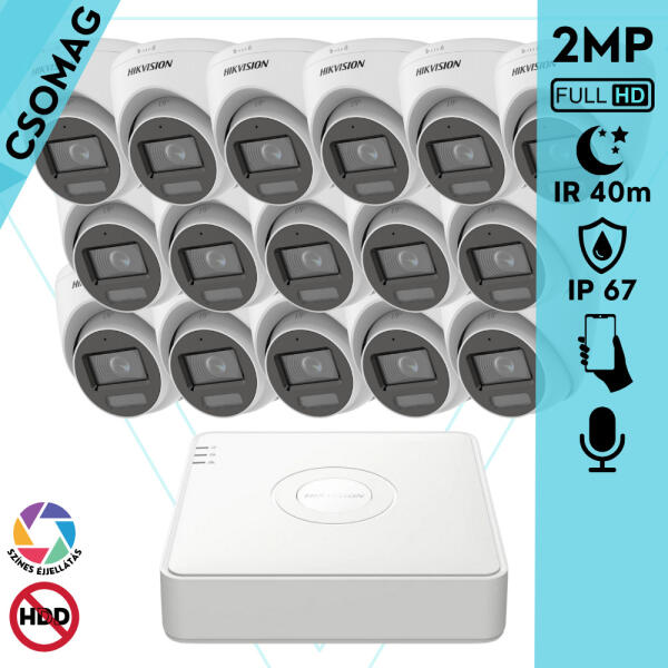 Hikvision 16 turret kamerás analóg megfigyelőrendszer 2MP biztonsági kamera, IR megvilágítás 40 m, fehér fény 20 m, beépített mikrofon, kültéri (DS7116HGHIM1T-DS2CE78D0TLFS28MM-TURRET-16)