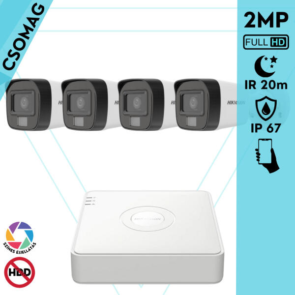 Hikvision 4 cső kamerás analóg megfigyelőrendszer 2MP biztonsági kamera, IR megvilágítás 20 m, fehér fény 20 m, kültéri Hikvision DS-2CE16D0T-EXLF (2.8mm)– 2 MP Dual Light Fix Mini Bullet Kamera, IR megvilágítás 20 m, fehér fény 20 m A Hikvision DS-2CE16D0T-EXLF (2.8mm) egy kompakt, mégis nagy teljesítményű kültéri mini bullet kamera, amely Full HD (1920×1080) felbontásban biztosít éles és részletgazdag képet. A Dual Light technológia segítségével a készülék automatikusan vált az infravörös (IR) és a fehér fény üzemmód között, így éjszaka is színes és tiszta felvételeket készít akár 20 méteres távolságig . Hikvision DS-7104HGHI-M1/T – 4 csatornás Turbo HD Digitális Videórögzítő, 1080p lite@25fps, 720p@25fps, 1×2MP IP, koax audio A Hikvision DS-7104HGHI-M1/T egy megbízható, kompakt méretű 4 csatornás Turbo HD DVR , amely kiválóan alkalmas kisebb biztonsági rendszerek kiépítéséhez vagy korszerűsítéséhez. A készülék támogatja az AHD/TVI/CVI/CVBS és IP kamerákat, így rugalmas megoldást kínál vegyes rendszerekhez is.