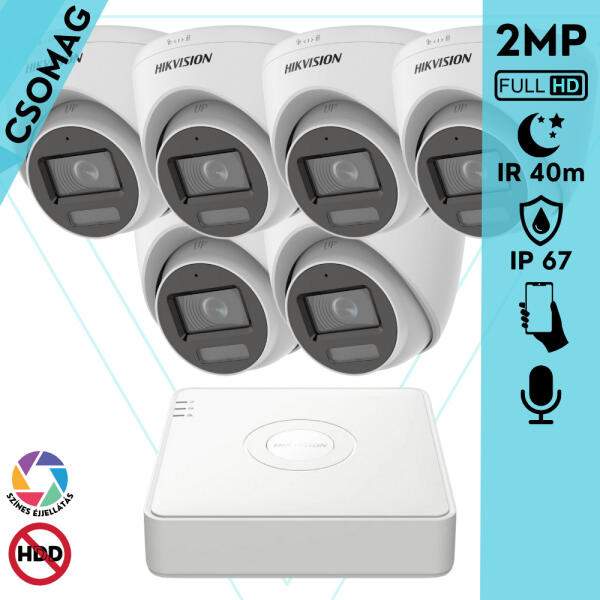 Hikvision 6 turret kamerás analóg megfigyelőrendszer 2MP biztonsági kamera, IR megvilágítás 40 m, fehér fény 20 m, beépített mikrofon, kültéri Hikvision DS-2CE78D0T-LFS (2.8mm) – 2 MP Dual Light Audio Fix Turret Kamera, IR megvilágítás 40 m-ig, fehér fény 20 m-ig, beépített mikrofon A Hikvision DS-2CE78D0T-LFS (2.8mm) modern, nagy teljesítményű kültéri turret kamera, amely Full HD (1920×1080) felbontásban rögzít kristálytiszta képeket. A Dual Light technológia ötvözi az akár 40 m-es infravörös éjjellátást és a 20 m-es fehér fény megvilágítást, így minden körülmények között részletgazdag és színes felvételeket biztosít. Beépített mikrofonja lehetővé teszi a nagy minőségű hangrögzítést koaxiális kábelen keresztül, így teljesebb biztonsági megfigyelést nyújt. Hikvision DS-7108HGHI-M1/T – 8 csatornás Turbo HD digitális videórögzítő, 1080p lite@15fps, 720p@15fps, 2×5MP IP, koax audio A Hikvision DS-7108HGHI-M1/T egy megbízható és sokoldalú 8 csatornás DVR (Digital Video Recorder), amely ideális választás kis- és közepes méretű biztonsági kamera rendszerek kiépítéséhez. Támogatja a HD-TVI, AHD, CVI, CVBS analóg kamerákat, valamint IP kamerákat is, így rugalmasan illeszthető új vagy meglévő megfigyelőrendszerekhez. A H. 265+ videótömörítés és a 1080P Lite felbontás révén a készülék kiváló képminőséget biztosít alacsony tárhely- és sávszélesség-igény mellett. A HDMI és VGA kimenetek lehetővé teszik a Full HD megjelenítést, míg a kétirányú hang funkcióval valós idejű kommunikáció is lehetséges a kamerarendszeren keresztül.