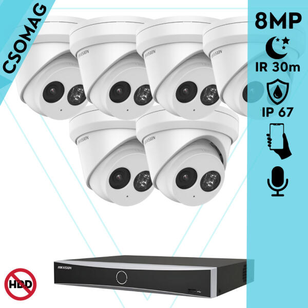 Hikvision 6 turret kamerás IP megfigyelőrendszer 8MP turret biztonsági kamera, 2.8 mm-es fix objektívvel, PoE, IR LED 30m, beépített mikrofonnal, fém ház, kültéri (DS7608NXIK18PD-DS2CD2383G2IU28-TURRET-6)