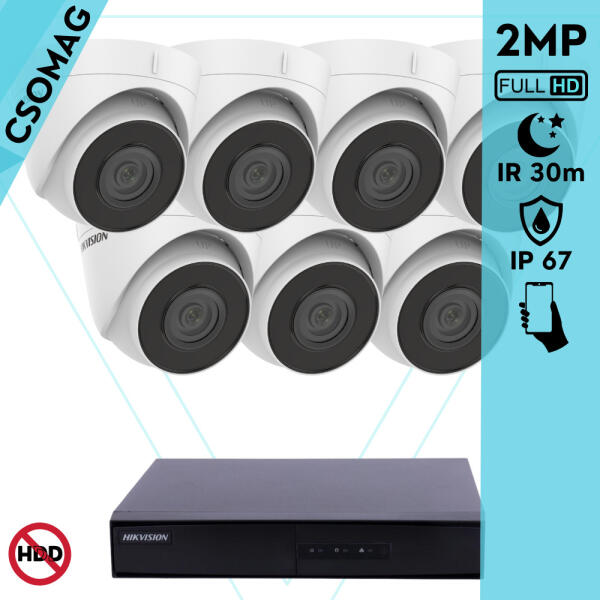 Hikvision 7 turret kamerás IP megfigyelőrendszer 2MP HD turret biztonsági kamera, 2.8 mm-es fix objektívvel, PoE, beépített mikrofonnal, IR LED 30m, kültéri, fém ház (DS7108NIQ18PM-DS2CD1321I28MMF-TURRET-7)
