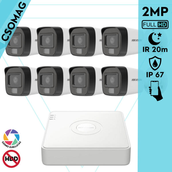 Hikvision 8 cső kamerás analóg megfigyelőrendszer 2MP biztonsági kamera, IR megvilágítás 20 m, fehér fény 20 m, kültéri Hikvision DS-2CE16D0T-EXLF (2.8mm)– 2 MP Dual Light Fix Mini Bullet Kamera, IR megvilágítás 20 m, fehér fény 20 m A Hikvision DS-2CE16D0T-EXLF (2.8mm) egy kompakt, mégis nagy teljesítményű kültéri mini bullet kamera, amely Full HD (1920×1080) felbontásban biztosít éles és részletgazdag képet. A Dual Light technológia segítségével a készülék automatikusan vált az infravörös (IR) és a fehér fény üzemmód között, így éjszaka is színes és tiszta felvételeket készít akár 20 méteres távolságig . Hikvision DS-7108HGHI-M1/T – 8 csatornás Turbo HD digitális videórögzítő, 1080p lite@15fps, 720p@15fps, 2×5MP IP, koax audio A Hikvision DS-7108HGHI-M1/T egy megbízható és sokoldalú 8 csatornás DVR (Digital Video Recorder), amely ideális választás kis- és közepes méretű biztonsági kamera rendszerek kiépítéséhez. Támogatja a HD-TVI, AHD, CVI, CVBS analóg kamerákat, valamint IP kamerákat is, így rugalmasan illeszthető új vagy meglévő megfigyelőrendszerekhez. A H. 265+ videótömörítés és a 1080P Lite felbontás révén a készülék kiváló képminőséget biztosít alacsony tárhely- és sávszélesség-igény mellett. A HDMI és VGA kimenetek lehetővé teszik a Full HD megjelenítést, míg a kétirányú hang funkcióval valós idejű kommunikáció is lehetséges a kamerarendszeren keresztül.