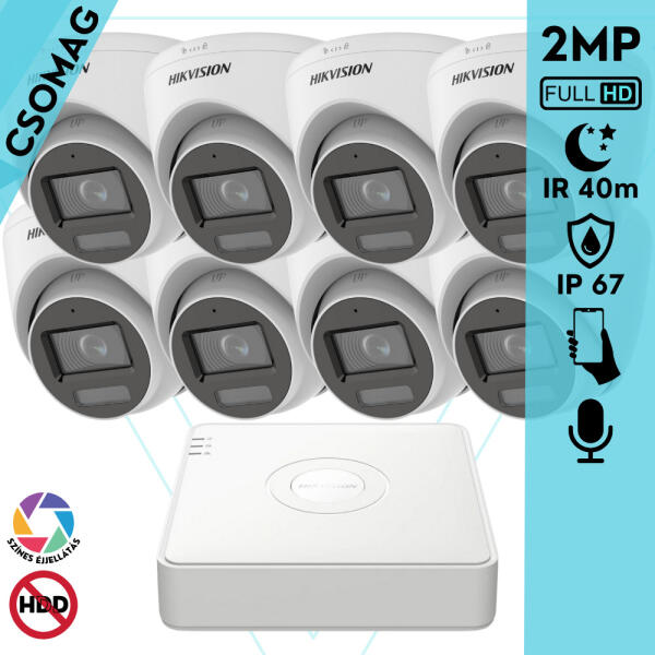 Hikvision 8 turret kamerás analóg megfigyelőrendszer 2MP biztonsági kamera, IR megvilágítás 40 m, fehér fény 20 m, beépített mikrofon, kültéri Hikvision DS-2CE78D0T-LFS (2.8mm) – 2 MP Dual Light Audio Fix Turret Kamera, IR megvilágítás 40 m-ig, fehér fény 20 m-ig, beépített mikrofon A Hikvision DS-2CE78D0T-LFS (2.8mm) modern, nagy teljesítményű kültéri turret kamera, amely Full HD (1920×1080) felbontásban rögzít kristálytiszta képeket. A Dual Light technológia ötvözi az akár 40 m-es infravörös éjjellátást és a 20 m-es fehér fény megvilágítást, így minden körülmények között részletgazdag és színes felvételeket biztosít. Beépített mikrofonja lehetővé teszi a nagy minőségű hangrögzítést koaxiális kábelen keresztül, így teljesebb biztonsági megfigyelést nyújt. Hikvision DS-7108HGHI-M1/T – 8 csatornás Turbo HD digitális videórögzítő, 1080p lite@15fps, 720p@15fps, 2×5MP IP, koax audio A Hikvision DS-7108HGHI-M1/T egy megbízható és sokoldalú 8 csatornás DVR (Digital Video Recorder), amely ideális választás kis- és közepes méretű biztonsági kamera rendszerek kiépítéséhez. Támogatja a HD-TVI, AHD, CVI, CVBS analóg kamerákat, valamint IP kamerákat is, így rugalmasan illeszthető új vagy meglévő megfigyelőrendszerekhez. A H. 265+ videótömörítés és a 1080P Lite felbontás révén a készülék kiváló képminőséget biztosít alacsony tárhely- és sávszélesség-igény mellett. A HDMI és VGA kimenetek lehetővé teszik a Full HD megjelenítést, míg a kétirányú hang funkcióval valós idejű kommunikáció is lehetséges a kamerarendszeren keresztül.