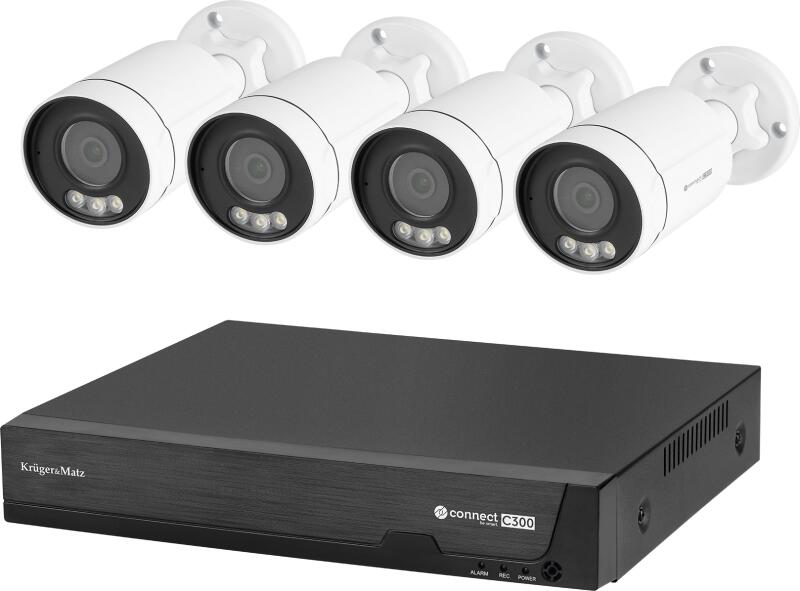 IP megfigyelő készlet Kruger&Matz Connect C300A Connect C300 egy kiváló minőségű kamerarendszer rögzítővel, amely tökéletesen megfelel otthoni vagy céges megfigyelőrendszerként. Rendelkezésre áll 4 darab 108° látószögű kamera. Fontos, hogy a kamerák zárt házának köszönhetően az IP67 védettségi osztályuk révén ellenállnak az időjárási körülményeknek. Működésüket nem befolyásolja sem a nagy hőség, sem az intenzív eső, sem a hideg fagy, így az év minden napján hozzájárulnak a biztonsághoz való gondoskodáshoz. Állandó megfigyelésTartsa mindent állandóan ellenőrzés alatt! A Wi-Fi kapcsolatnak köszönhetően a Connect C300 külső megfigyelőrendszer okostelefonból, a TuyaSmart alkalmazással vezérelhető. Függetlenül attól, hogy hol tartózkodik, bármikor ellenőrizheti, mi történik az udvarán. Egyértelmű ellenőrzésA Kruger&Matz Connect C300 ideális azok számára, akik igazán kiváló minőségű felvételeket várnak el megfigyelőrendszerük részéről! A készlet lehetővé teszi a felvételt