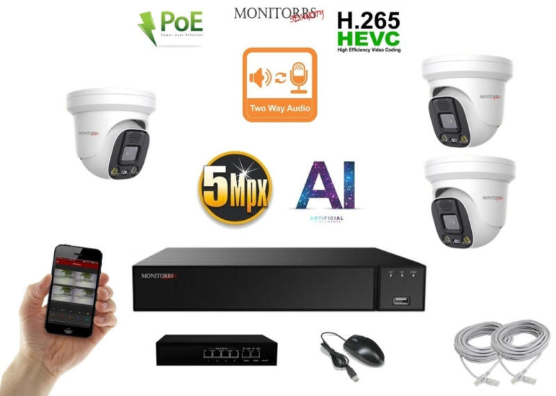 Monitorrs Security - AI IP Aktív dóm kamerarendszer 3 kamerával switchel 5 mpix - 6077K3B